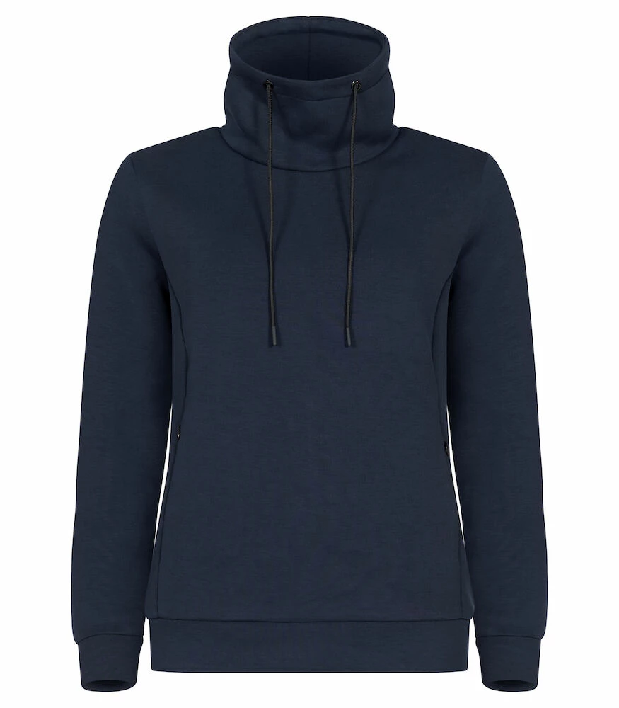 High-neck sweatshirt made from soft fabric. 2 zippered hidden pockets. Adjustable drawstring and easily removable neck label for replacement if necessary.