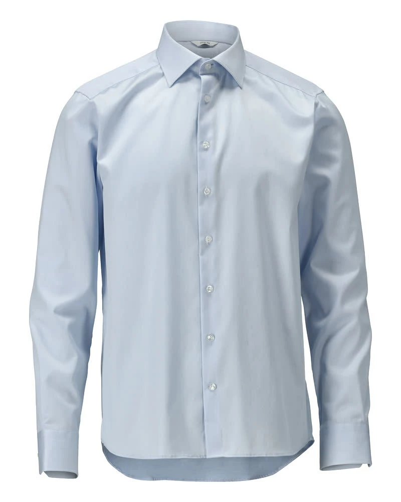 Kapea istuvuus. Kavennus selässä varmistaa hyvän istuvuuden ja auttaa paitaa myötäilemään kehon liikkeitä. Erityisen pitkäkuituista puuvillaa. Cut away -kaulus. Jäykistetty kaulus. Nappikiinnitys. Säädettävät hihansuut