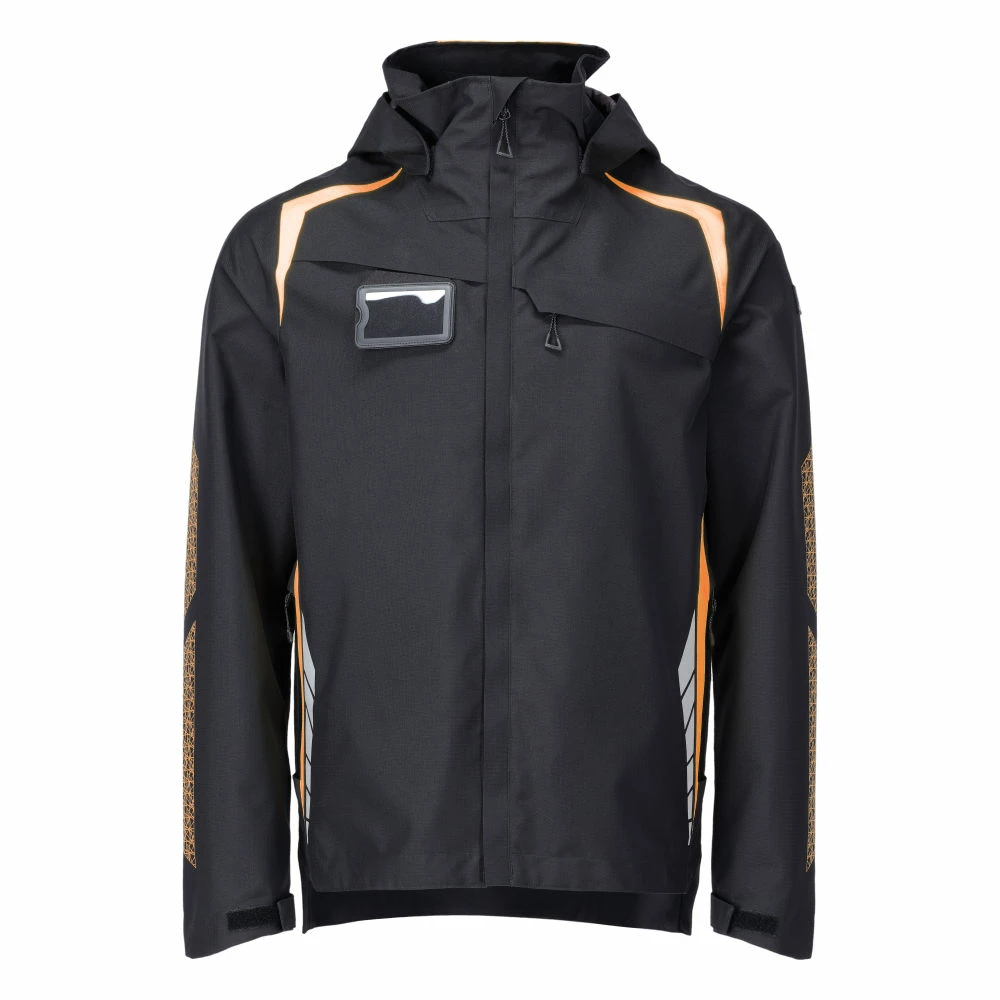 Breathable, windproof, and waterproof. Two-tone. Taped seams. Detachable hood with drawstring. High collar. Zipper closure and double wind flap. Zippered chest pocket. D-ring. Inner pocket. Ergonomically shaped sleeves allow for great freedom of movement. Internal storm flap at the sleeves. Front pockets. Features logo and reflectors.