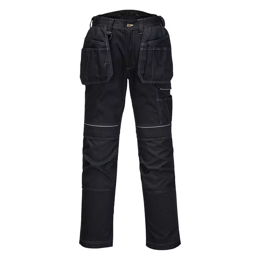 Sturdy stretch work trousers made with a technical two-way stretch fabric that ensures maximum freedom of movement while you work. Numerous practical features including shaped, top-loading knee pad pockets, extendable legs, gussets that prevent seam stress, and versatile thigh pockets. Reinforced areas are made with Oxford fabric, and triple stitching is used in high durability areas.