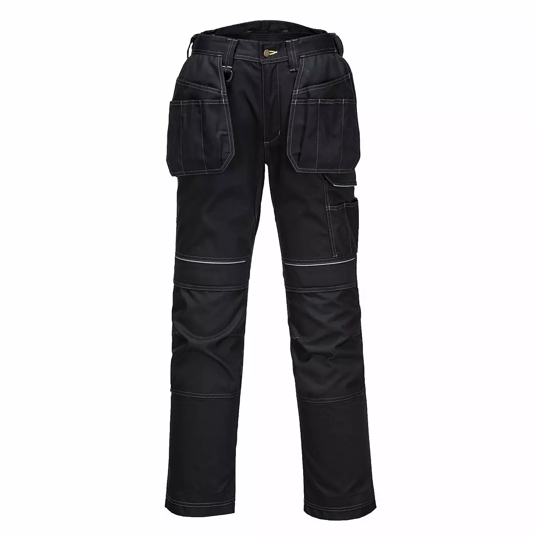 Durable work trousers made from strong 300g polyester-cotton blend fabric. Features a modern slim fit design with adjustable legs by unpicking seams. Includes top-loading knee pad pockets, triple stitched seams, and reinforcement fabric in high wear areas. The knee pockets are shaped with Orford fabric reinforcements. A concealed ID card pocket is located behind the hanging pockets.