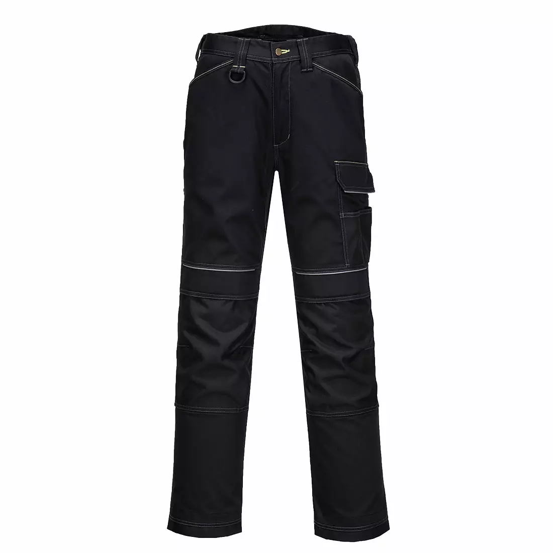 Stylish and comfortable work trousers. The trousers feature multiple pockets including a hammer loop, reinforced crotch seams, and patches in high-wear areas for increased durability. The length of the legs is adjustable.