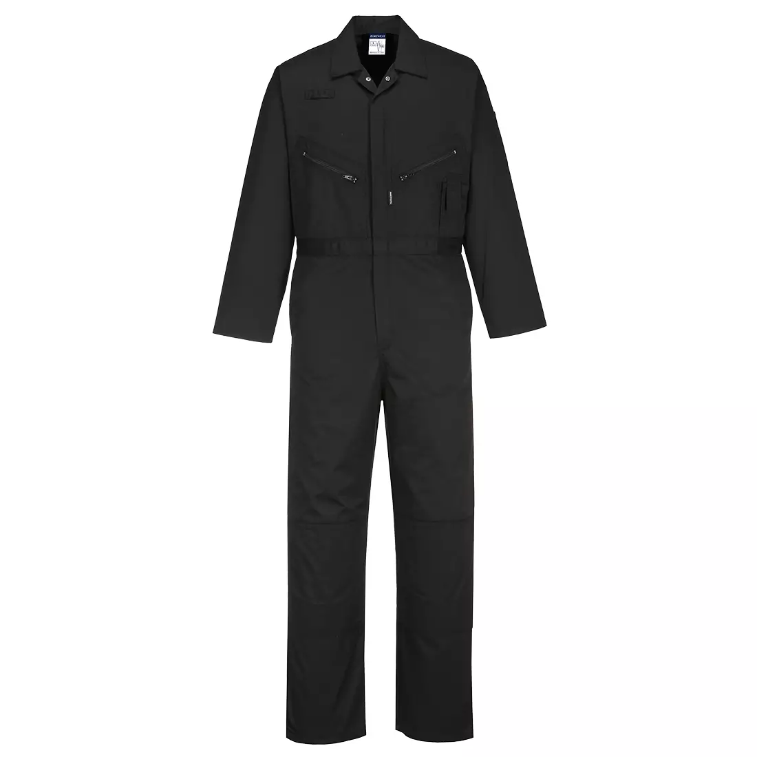 Comfortable and protective work overalls featuring a secured front zipper closure. The overalls have knee pad pockets, a shaped back for flexibility, and multiple spacious storage pockets.