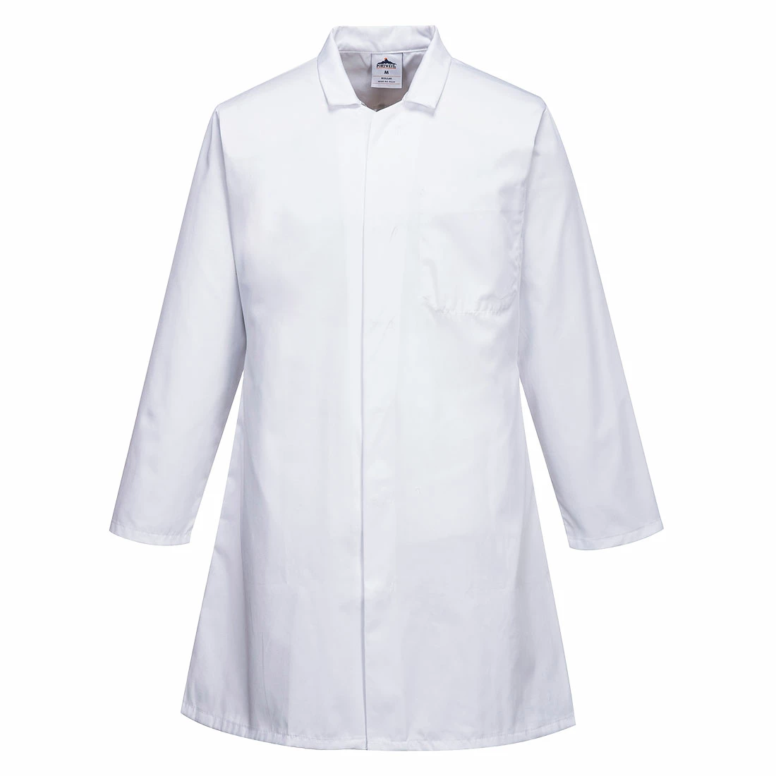 Designed for the food industry. The jacket features a protected snap closure and its 3 pockets provide ample storage space. Made from a highly durable Kingsmill polyester and cotton blended fabric.