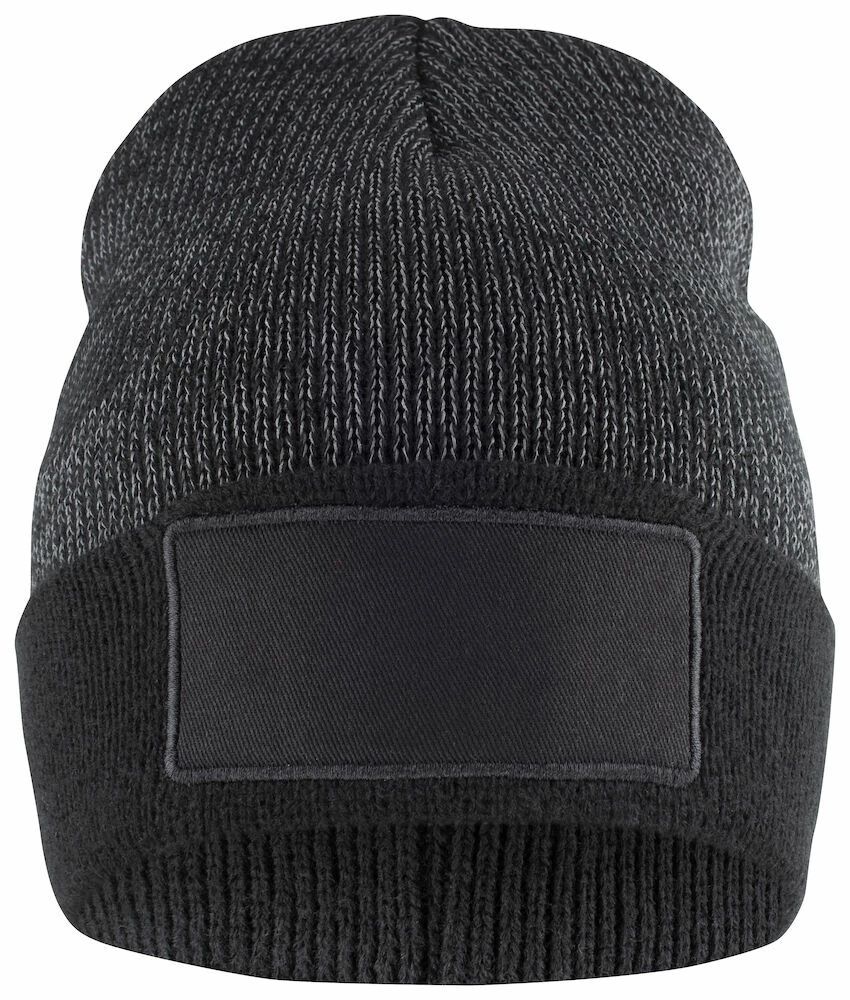 Cuffed beanie with reflective knit at the bottom. Smooth area in the front for printing, size 4.5 x 9.5 cm.