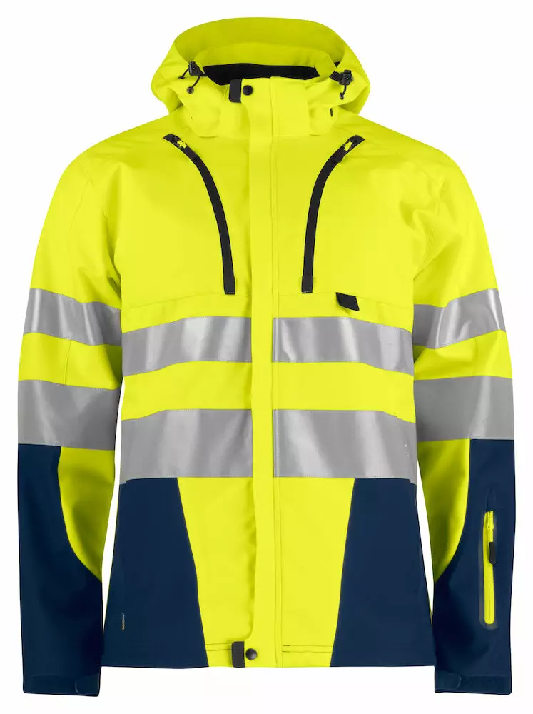 Tuulen- ja vedenpitävä tekninen softshell-huomiotakki. Kaksi rintataskua, joista vasemmassa puhelintasku. Paikka ID-korttipidikkeelle. Kaksi sivutaskua. Hihatasku vasemmalla puolella. Vasemmalla sisätasku, jossa aukko kuulokejohdolle. Ilmanvaihtoa parantavat vetoketjut kainaloissa. Vyötäröllä kiristysnauha. Säädettävät hihansuut. Pidennetty selkäosa lisää käyttömukavuutta. Heijastavat tereet hihoissa ja selkäosassa. Säädettävä ja irrotettava huppu. Kauluksessa mukava fleecevuori.
