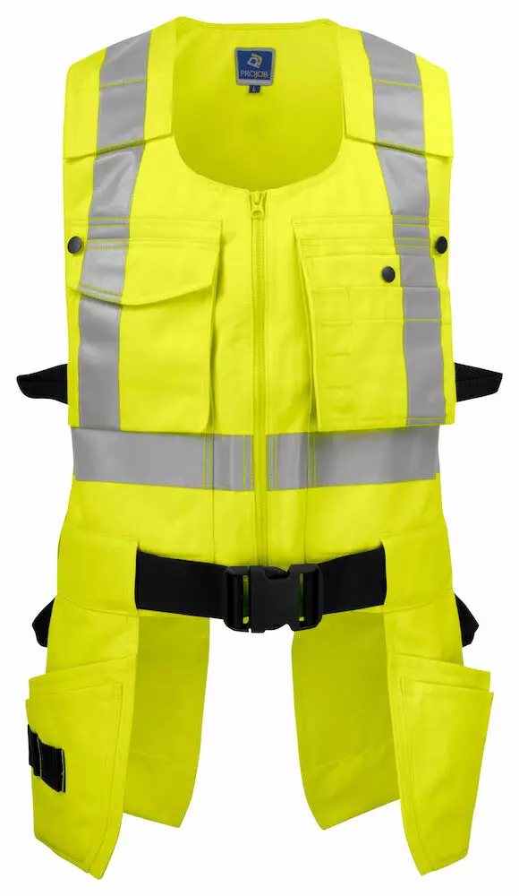 Monikäyttöinen työkaluliivi huomioväreissä. Säädettävä vyö pitää liivin paikoillaan ja vähentää hartioiden kuormitusta. Kaksisuuntainen vetoketju edessä. Kaksi rintataskua ja piilotettu sisätasku hanskoille tai papereille. Neljä roikkuvaa naulataskua. Olkapäillä on tarrasäätö ja myös liivin leveyttä pystytään säätämään.