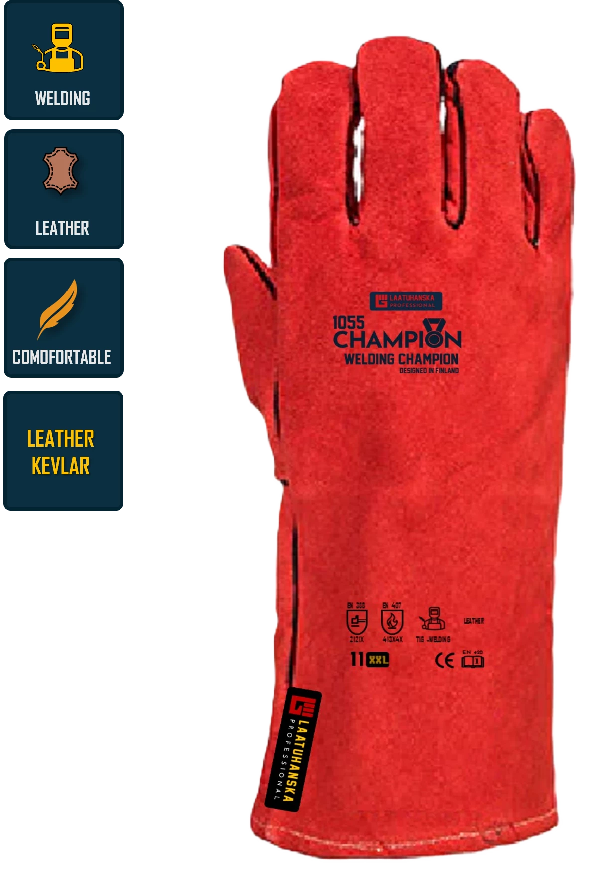 Laatuhanska Champion on hitsauskäsine, se on sertifioitu EN 407- ja EN 12477 -standardien mukaisesti. Naudan haljasnahkaa, selkäosa yhtä kappaletta, pit. 35,5cm, täysipituinen vuori.