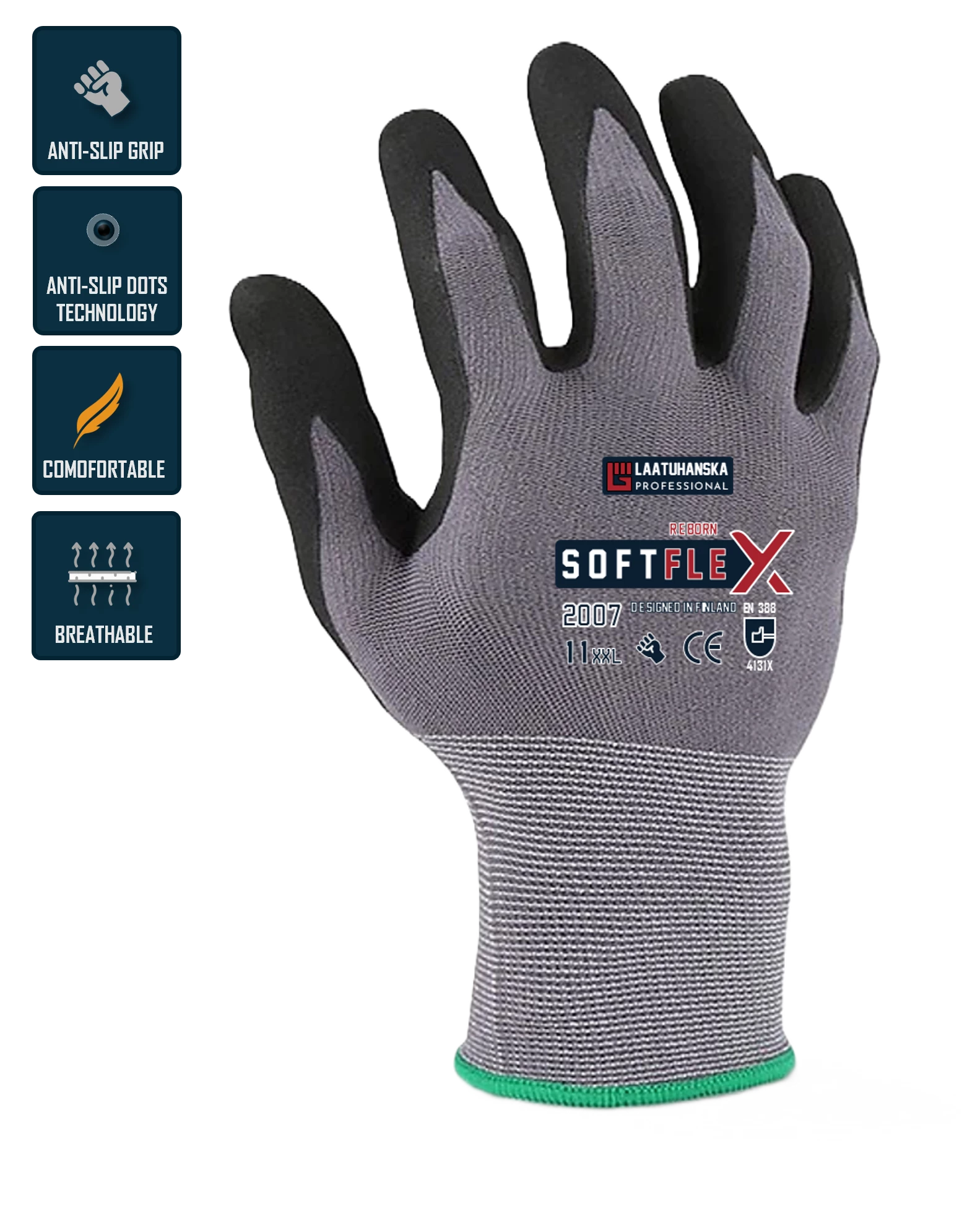 Laatuhanska Soft Flex Reborn Erittäin kevyessä 15gg nailonvuoressa on pehmeällä nitriilivaahdolla pinnoitettu kämmenosa, joka takaa parhaan mahdollisen mukavuuden, näppäryyden ja herkkyyden. Tuntoherkkä käsine suojaa hyvin kosteudelta, öljyiltä, rasvoilta ja jopa kuumuudelta.