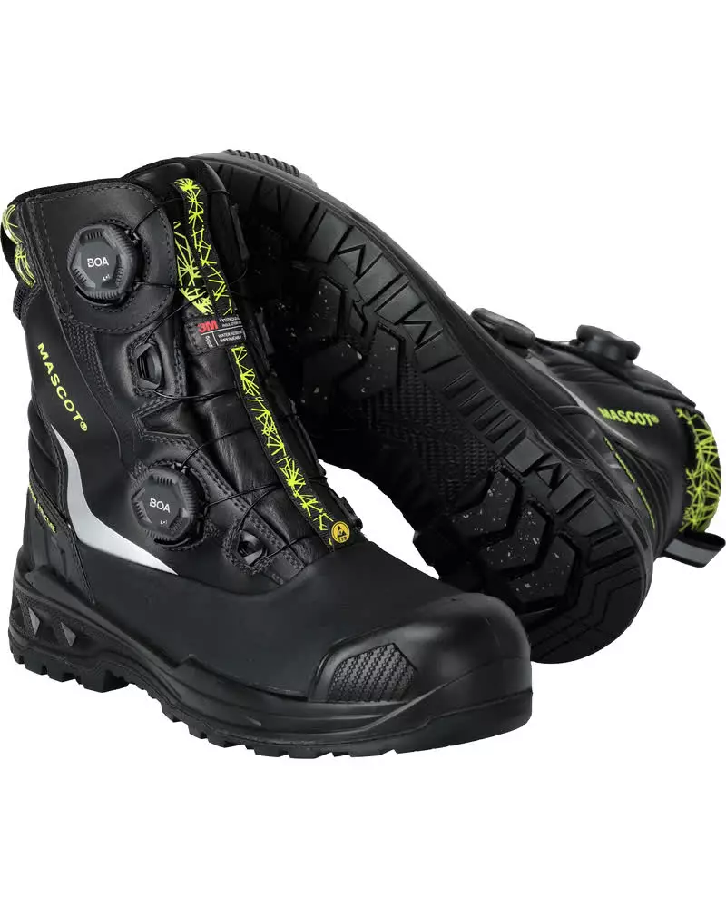 BOA® Fit System för påtagning och avtagning, som består av en spole, metalltråd och guider. Kompositskydd i tåboxen. MASCOLAYER® textilnättygsskydd. Multifunktionell sula med styvhet och stötdämpande hälkudde. Mellansula i PU. Friktionsgummi på yttersulan. Avtagbara, antistatiska och hållbara innersulor. Stötdämpande innersula som effektivt absorberar och transporterar fukt. Sulan är olja- och bensinbeständig. Värmebeständig sula max. 300°C kontaktvärme. Greppmönster. Thinsulate?-isolering. Vattentät MASCOTEX® membran. Vattenavvisande och andningsbart ytmaterial. Lämpliga för arbete på knä. TPU hälförstärkning. Sulan har halkskydd och är självrenande, vilket garanterar bra grepp på alla typer av ytor. Spårfri yttersula - lämnar inga märken.