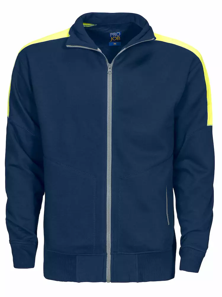 Huvtröja med hög krage. Fluorescerande tyg på axlarna. Ribbstickade ärmmuddar och nederkant. Dragkedjefickor.