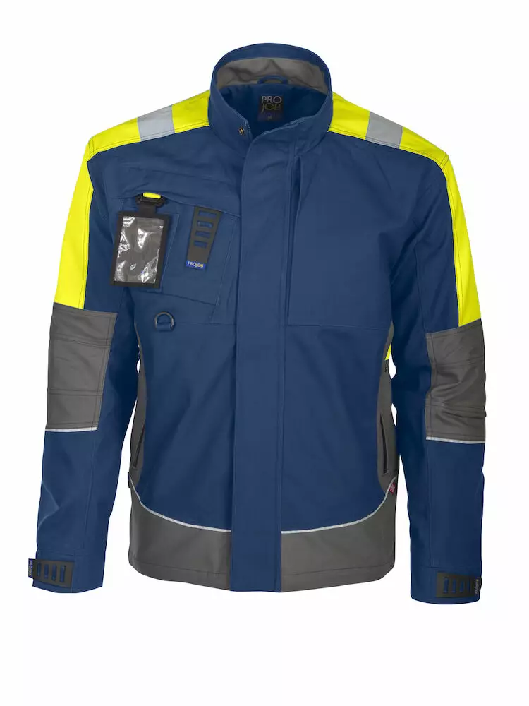 Stilren jacka med formsydda ärmar och justerbara ärmslut och fåll. Två dragkedjefickor på sidorna och en på bröstet, med plats för mobiltelefon, små verktyg och nycklar. Plats för ID-kort. Reflekterande och fluorescerande område på axlarna. Fodret kan öppnas med dragkedja, vilket underlättar märkning och brodering av jackan.
