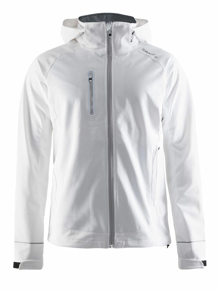 Vattenavvisande behandlad softshell-jacka. Justerbara ärmslut, avtagbar huva och reflekterande tryck. Vattentät dragkedja. Två sidofickor.