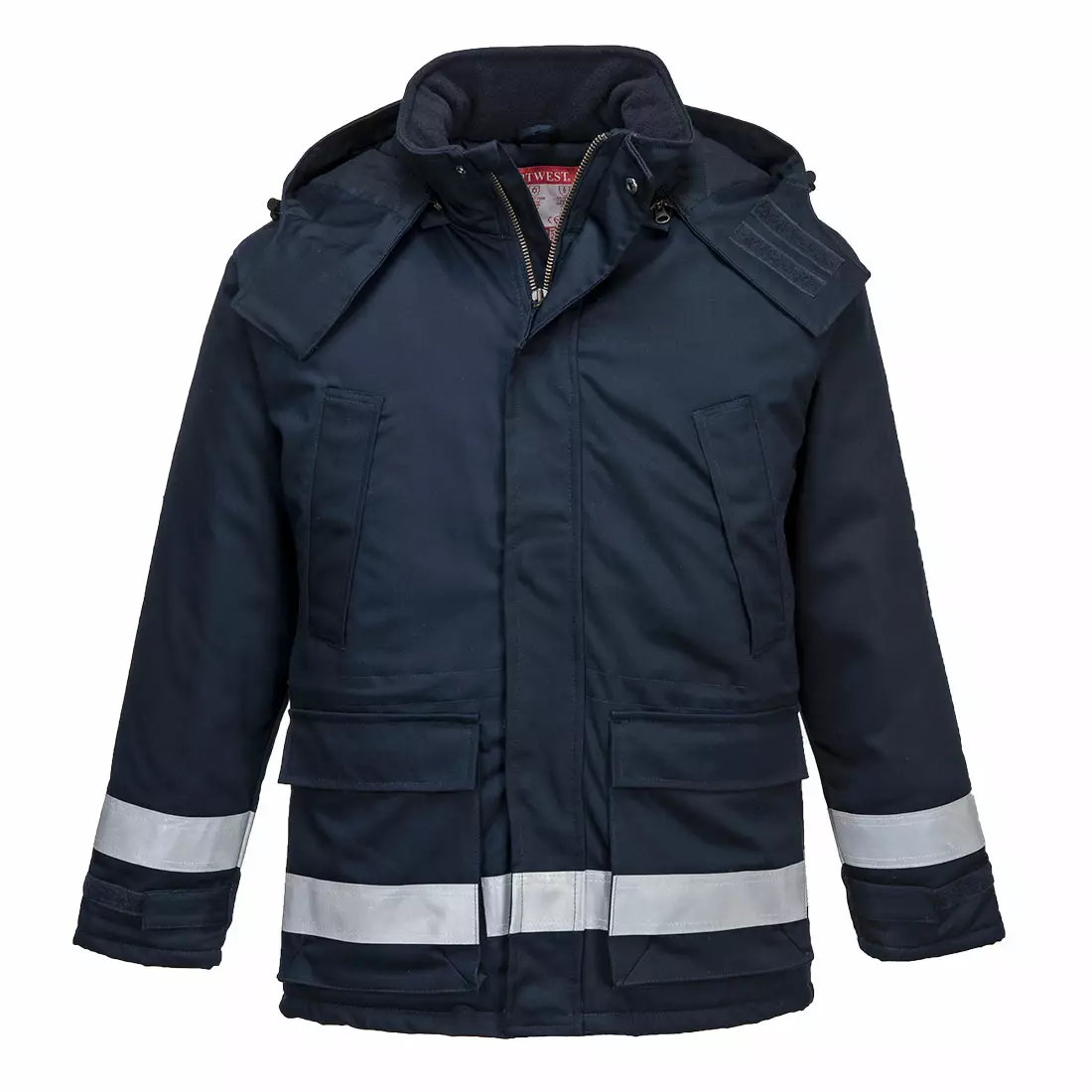 Denna FR-vinterjacka är perfekt anpassad för offshore-industrins krav. Byggd av samma yttertyg som FR50 och kombinerad med en speciellt tjock vaddering och FR-bomullsfoder för extra värme. Denna stil har också en mycket synlig reflexband som är sytt två gånger för att förbättra synligheten. Uppfyller alla nödvändiga EN-standarder, inklusive svetsstandard. Funktioner inkluderar tredubbelt sydda sömmar, synlighetsband på axlar, armar och kropp, dold 2-vägs mässingsdragkedja fram och två snedställda bröstfickor med flik. Klädesplagget har också justering inuti midjan för att säkerställa passform. En extra fördel med denna modell är en avtagbar huva med mässingsdragkedjeankare.