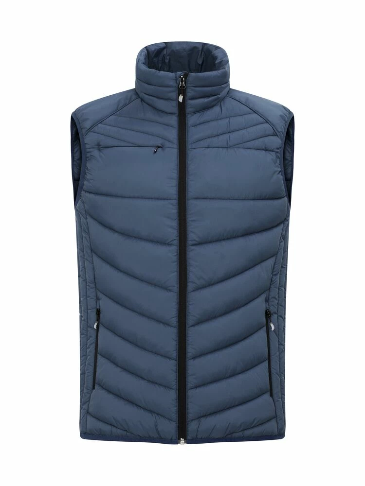 Varm men lätt väst med fyllning som påminner om dun. Tillverkad av återvunnen polyamid. 3 ytterfickor med dragkedja och 2 innerfickor. Elastiska resårer vid midjan. I dammodellen finns en avtagbar huva. Inkluderar en färgad hängare, en praktisk hörlurslösning och dragkedjevedare.