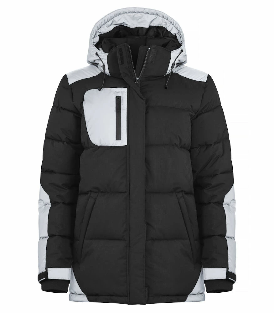 Varm reflektortoppjacka för vintern. Vattentät SBS-dragkedja i bröst- och sidofickor. Avtagbar och justerbar huva. Två stora nätfickor inuti. Dragsko i fållen och i dammodellen dragsko vid midjan. Elastisk trikå på ärmarnas insida.