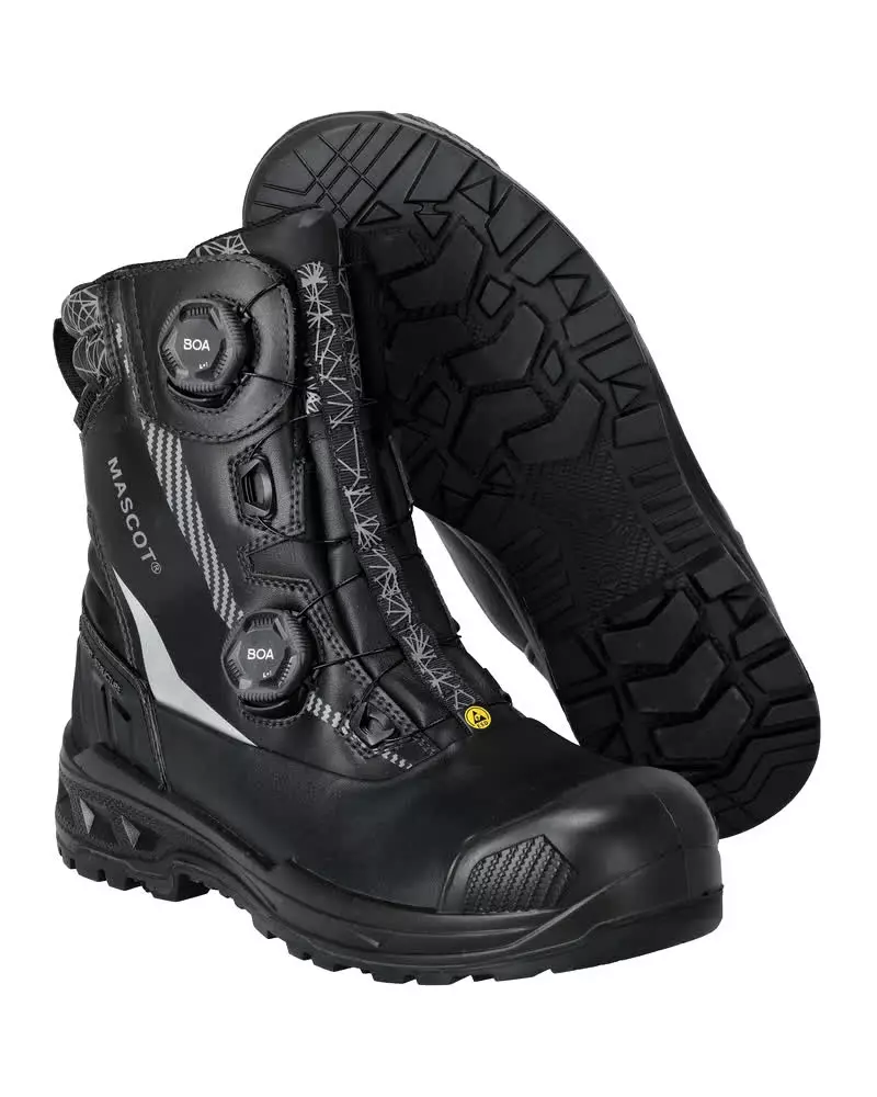 BOA® Fit System för enkel av- och påklädning, bestående av en ratt, metalltråd och ledningar. Kompositskydd för tårna. MASCOLAYER® textilspikskydd. Multifunktionell sulstyvhet och stötdämpande hälkudde. Mellansulan är tillverkad av PU. Friktionsgummi yttersula. Avtagbara, antistatiska och slitstarka innersulor. Stötdämpande innersula. Effektiv fuktupptagning och -transport. Sulan är olja- och bensinbeständig. Hög temperaturbeständig sula upp till 300°C kontaktvärme. Greppmönster. Vattentät MASCOTEX® membran. Vattenavvisande och andningsbart ytmaterial. Lämpliga för arbete i knästående position. TPU hälförstärkning. Sulan är halkskyddande och självrengörande vilket ger ett bra grepp på alla typer av ytor. Spårlös sula - lämnar inga märken.