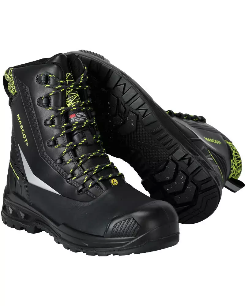 Snörning. Komposittåskydd. MASCOLAYER® textilspikskydd. Mångsidig mittsula och stötdämpande hälkudde. Mellansula i PU. Sål i halkskyddande gummi. Avtagbara, antistatiska och slitstarka innersulor. Stötdämpande innersula. Håler in och transporterar fukt effektivt. Sulan är olja- och bensinhärdig. Värmebeständig sula max. 300°C kontakttemperatur. Greppmönster. Thinsulate?-isolering. Vattentät membran MASCOTEX®. Vattenavvisande och andningsbart ytmaterial. Lämplig för arbete i knästående. TPU hälförstärkning. Stövelns halkskyddande och självrenande sula garanterar bra grepp på alla ytor. Spårfri sula - lämnar inga fläckar.