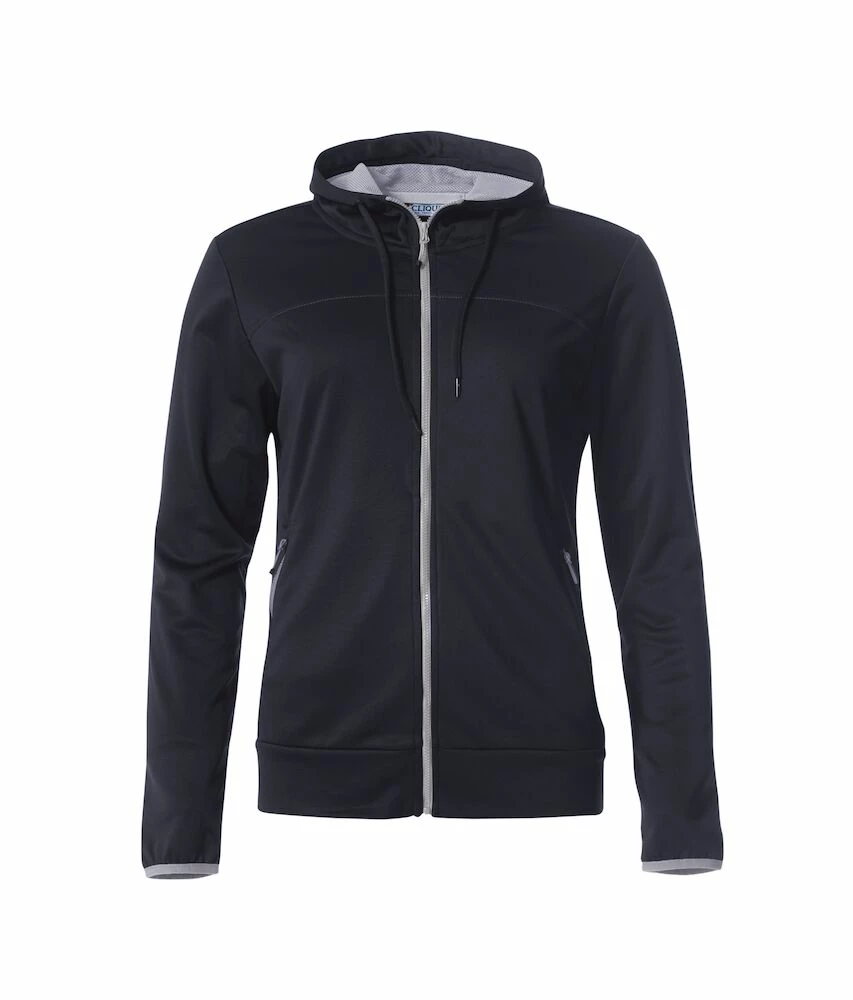 En bekväm hoodiejacka i mjuk, stretchig och behaglig polyester. Huvan har ett meshfoder och dragsnöre. Innerfickor och fickor med dragkedja fram. Praktiska lösningar för hörlurar: ficka med öppning och ögla i kragen.