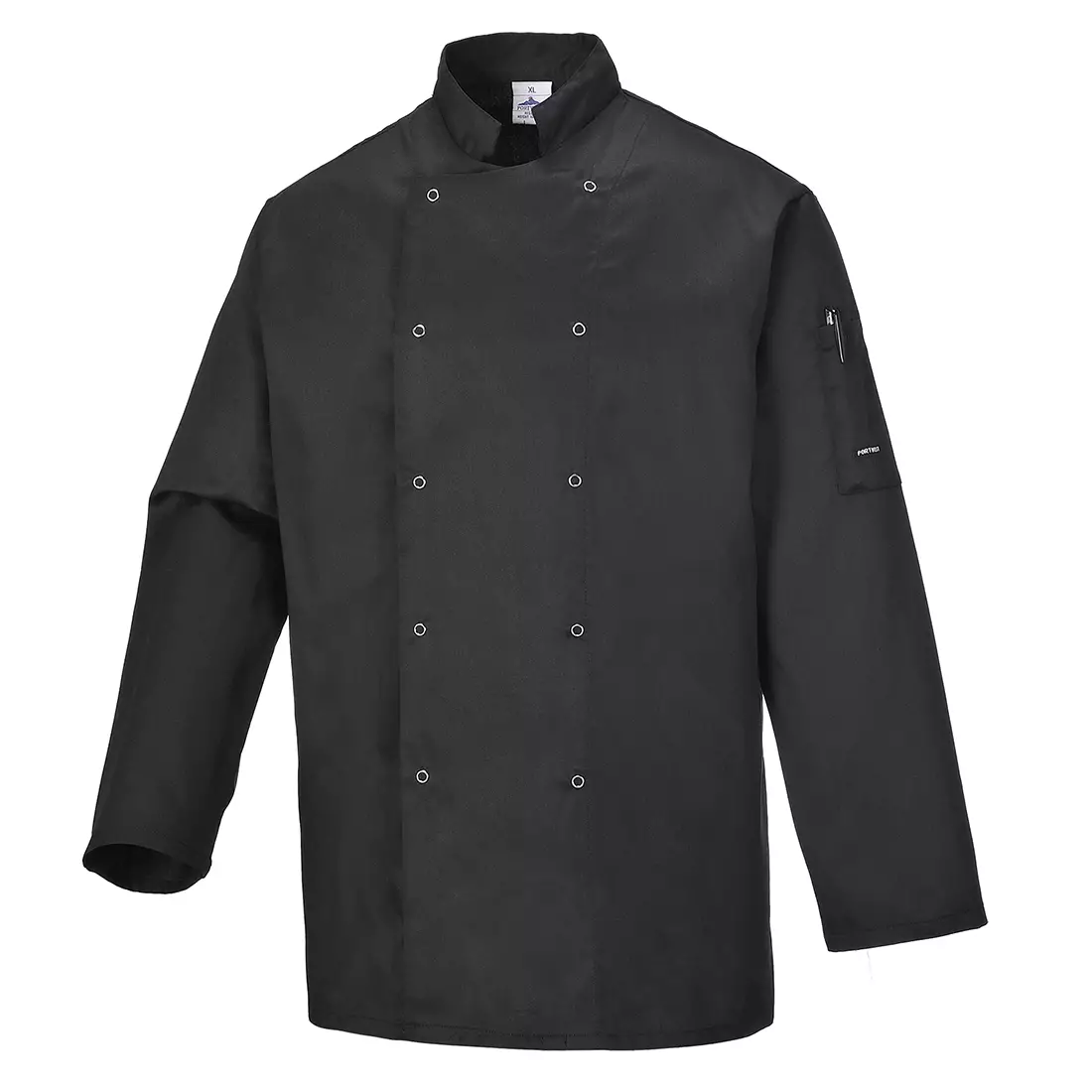 Suffolk-kockjackan är designad för professionellt bruk i moderna köksmiljöer. Bekväm och flexibel, med praktisk knäppning, håller denna modell sig stilren och snygg hela dagen.
