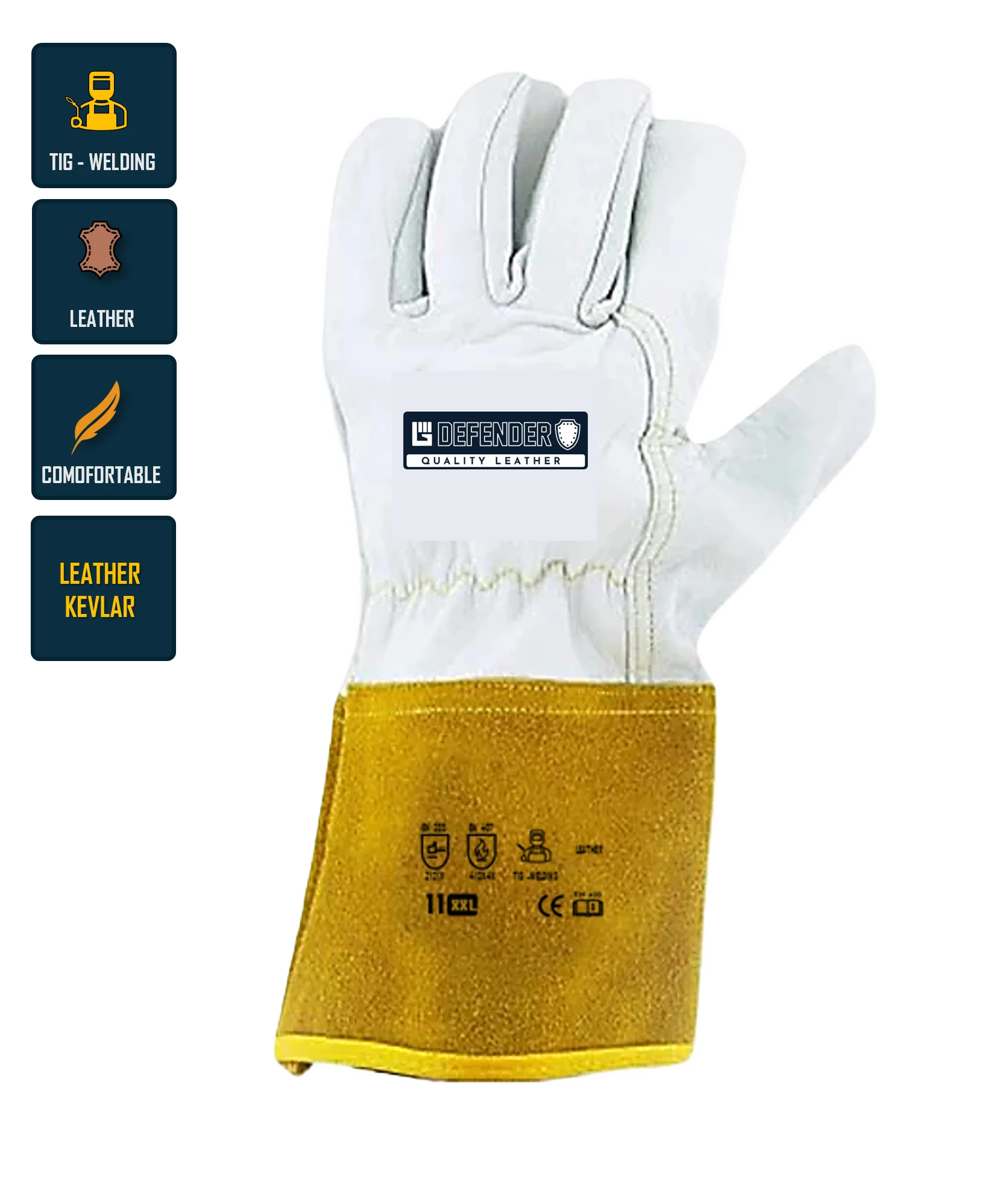 Laatuhanska Defender on Tig hitsaus hanska. Se valmistettu vuohen nahasta, joka on yksi markkinoiden pehmeimmistä ja vahvimmista nahoista. Nahka hengittää ja suojaa myös lämmöltä. Sopii hyvin työtehtäviin, joissa on suojauduttava kuumilta pinnoilta. Kevlar lanka.
